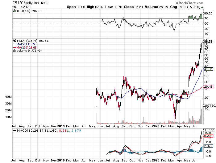 “America’s obsession with the internet is paying dividends to the companies that power websites for everything from shopping to social media,” says Bloomberg. “One of the biggest winners has been Fastly Inc., which has added nearly $6 billion in market value in less than two months, outpacing hot e-commerce stocks like Overstock.com Inc., Wayfair Inc. and Etsy Inc. since the end of April. The stock has gained nearly 250% in that time, making it the best performer among 43 companies in the S&P Internet Select Industry Index.