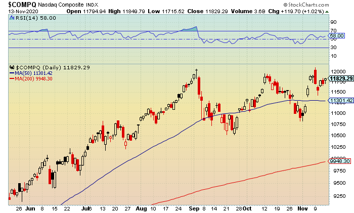 The Nasdaq tapped an afternoon high of 11,849 while finishing at 11,829 (+1%). Near-term and lower resistance at 11,800-11,900 was recovered. A pop above the latter would signal another run towards 12,000-12,100 with the current lifetime peak at 12,108.