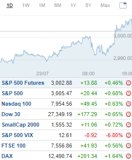 U.S. markets opened in positive territory on Monday while trading mostly higher throughout the session ahead of the busiest week of the 2Q earnings season. The blue-chips and small-caps experienced some choppiness afterwards but settled higher along with the overall market.Geopolitical tensions and trade talks remain in focus but volatility eased while closing just outside a key support level. Fedspeak will ease this week during a quiet period and ahead of next week’s decision on interest rates.The Nasdaq rallied 0.7% after testing a high of 8,218 ahead of the closing bell. Current and lower resistance at 8,200-8,275 was cleared and held with the recent all-time high at 8,264.The S&P 500 was up 0.3% following the afternoon run to 2,990. Prior and lower resistance at 3,000-3,025 held for the 3rd-straight session with the record high from earlier this month at 3,017.The Dow edged up 0.1% following the opening push to 27,227. Prior and lower resistance at 27,250-27,500 held with last Tuesday’s record high at 27,398. A close below the 27,00 level would be a slightly bearish signal with Monday’s intraday low tapping 27,088.The Russell 2000 gave back 0.2% after trading in an 11-point range while closing a point off its session low at 1,543. The fresh monthly session low held crucial support at 1,540-1,535 and the 50-day moving average.Technology showed the most sector strength after soaring 1.2% while Real Energy and Communication Services advanced of 0.4%. Consumer Staples were the weakest sector after falling -0.6% while Materials, Healthcare and Utilities declined -0.2%.