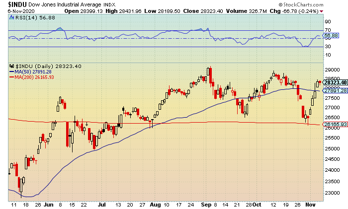 The Dow finished at 28,323 (-0.2%) after trading down to 28,189 shortly after the opening bell. New and upper support at 28,250-28,000 was breached but a level that held. A drop below the latter would suggest a retest towards 27,750-27,500.