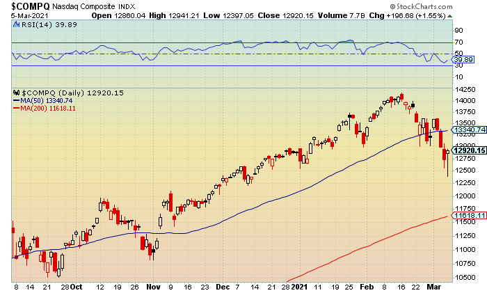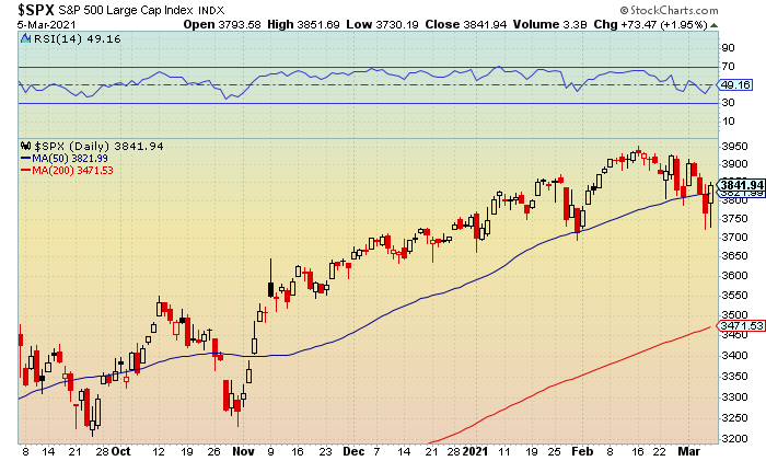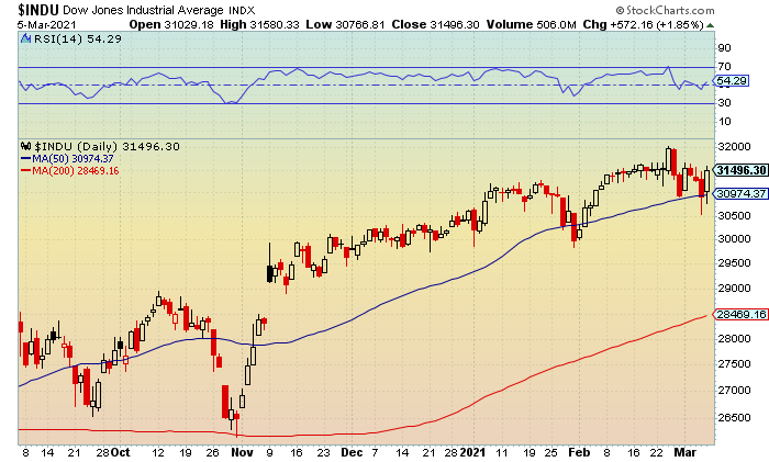 The stock market showed continued volatility on Friday despite a strong employment report that came in with a better-than-expected 379,000 jobs added in February. This reaffirmed the building momentum in the economic recovery, but also causing a rise in Treasury yields and concerns over higher inflation. The major indexes rallied in the final hour of trading, shaking off earlier declines while ending three-session losing streaks. The gains helped erase weekly losses for the broader market and the blue-chips as both closed higher while Tech and the small-caps settled lower for the week. The Russell 2000 showed the most strength after testing a late day peak of 2,193 before closing at 2,192 (+2.1%). Near-term and lower resistance at 2,175-2,200 was recovered. A move above the latter would signal continued upside towards 2,225-2,250. Below is a chart of the IWM.